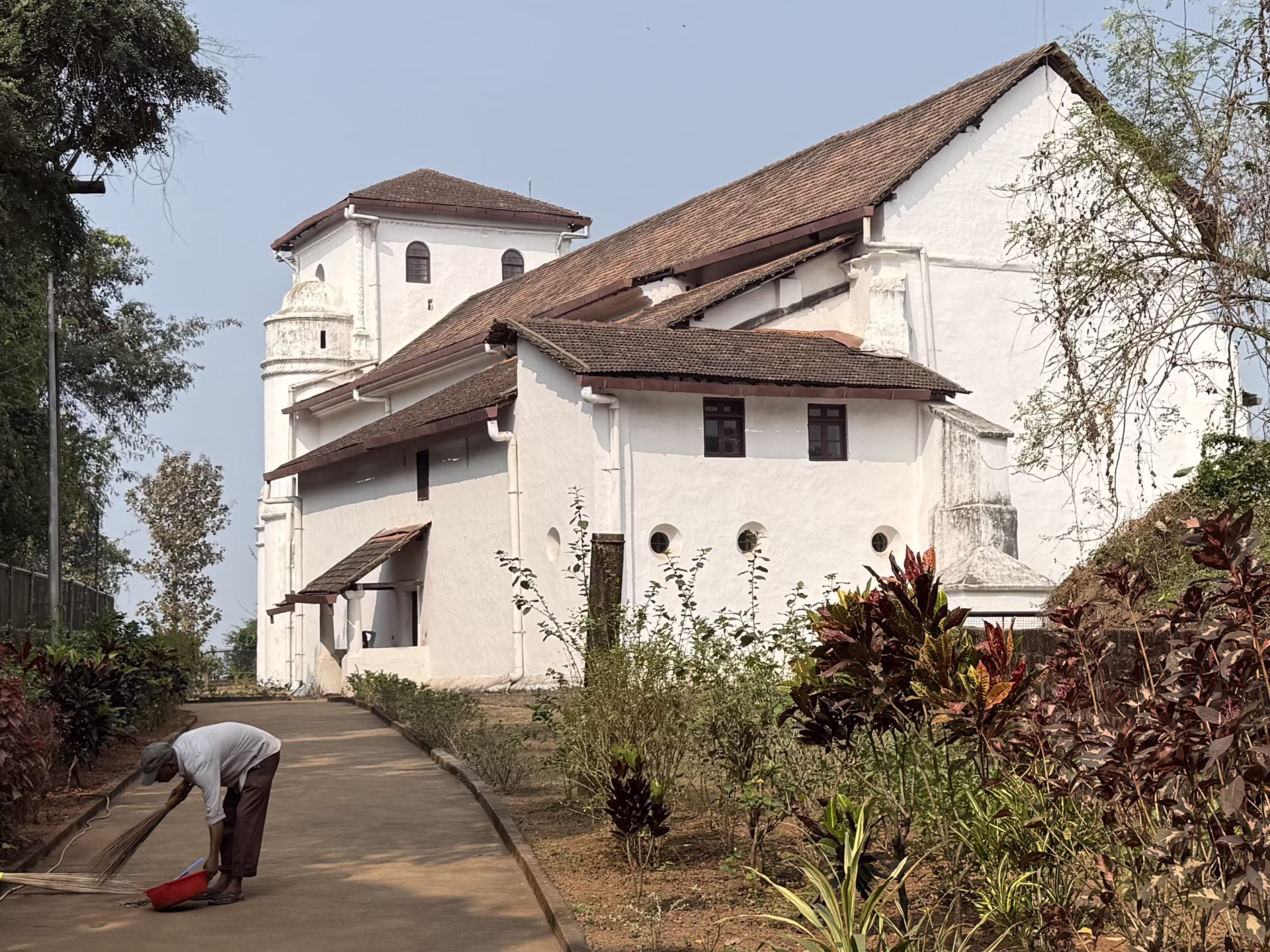 Antonio führt mich zuerst zu Our lady of the Rosary, hoch über dem Fluss Mandovi. Von dieser Anhöhe leitete Alfonso de Albuquerque 1510 den Angriff seiner Flotte auf die Hauptstadt des Yusuf Adil Shah. Hier hat er dann diese erste wehrhafte Kirche mit Schießscharten und der Möglichkeit, Kanonen zu positionieren, bauen lassen. Für den Fall, dass die Muslime zurückschlagen.